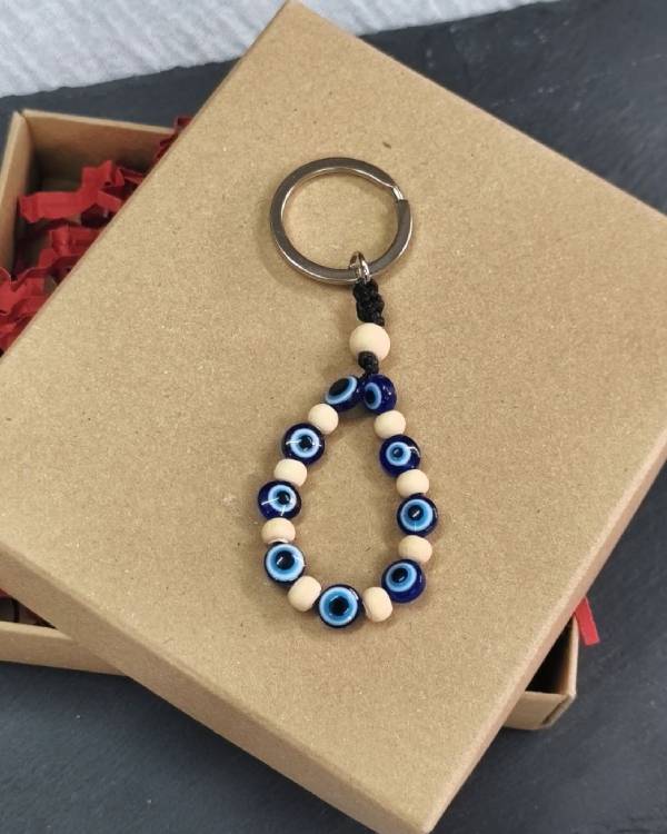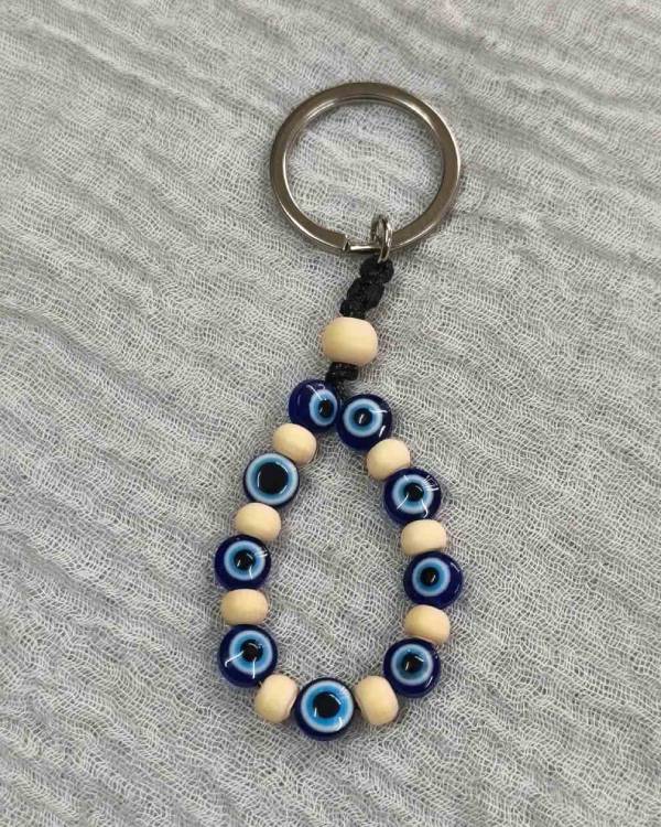 Μπρελόκ θυλάκι, με ματάκια, χάντρες ξύλινες και κρικάκι ασημί. Η δίασταση του είναι 10 εκ 'ολο μαζί και 6 εκ το σχέδιο.