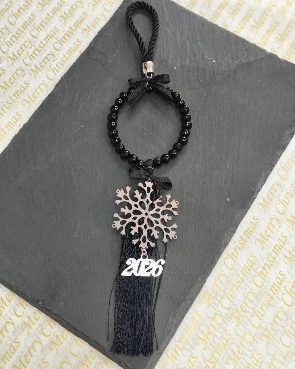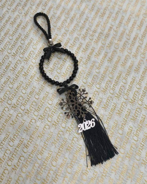 Χειροποίητο χριστουγεννίατικο γούρι με ατσάλινο στοιχείο χιονονιφάδα, στεφανάκι με χάντρες μαύρες, φούντα μαύρη, θυλάκι με σχοινί μαύρο και μεταλλικό στοιχείο 2026. Η δίασταση του στοιχείου είναι 6 Χ 6 εκ, το στεφανάκι είναι 8 Χ 8 εκ και 31 εκ ύψος. Θα το παραλάβετε σε συσκευασία δώρου.