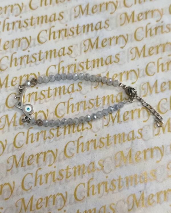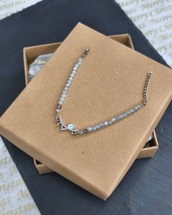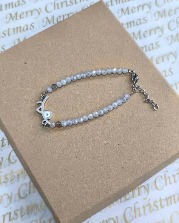 Χειροπιήτο βραχίολι με στοιχείο μεταλλικό 26, με μάτι και χάντρες κρύσταλλα γκρί και δίαφανες, περασμένες σε ατσαλόσυρμα, με κούμπωμα και με αλυσιδάκι αυξομείωσης. Το μάκρος του είναι 16 εκ, το στοιχείο είναι 3 Χ 1 εκ. Θα το παραλάβετε σε συσκευασία δώρου.