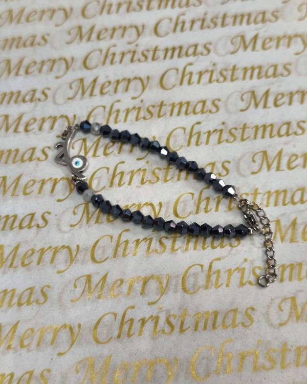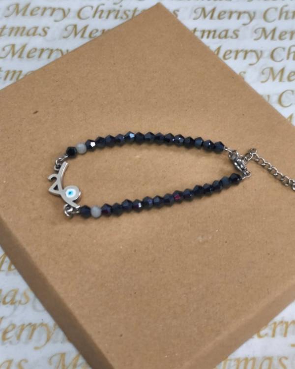Χειροπιήτο βραχίολι με στοιχείο μεταλλικό 26, με μάτι και χάντρες κρύσταλλα μπλέ και λευκές, περασμένες σε ατσαλόσυρμα, με κούμπωμα και με αλυσιδάκι αυξομείωσης. Το μάκρος του είναι 16 εκ, το στοιχείο είναι 3 Χ 1 εκ. Θα το παραλάβετε σε συσκευασία δώρου.