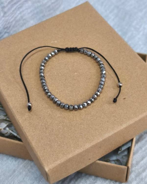 Χειροπιήτο βραχίολι με χάντρες κρύσταλλα σε ασημί χρώμα, περασμένες σε κηροκλωστή μαύρη και με κούμπωμα με αυξομείωση. Το μάκρος του είναι 16 εκ. Θα το παραλάβετε σε συσκευασία δώρου.