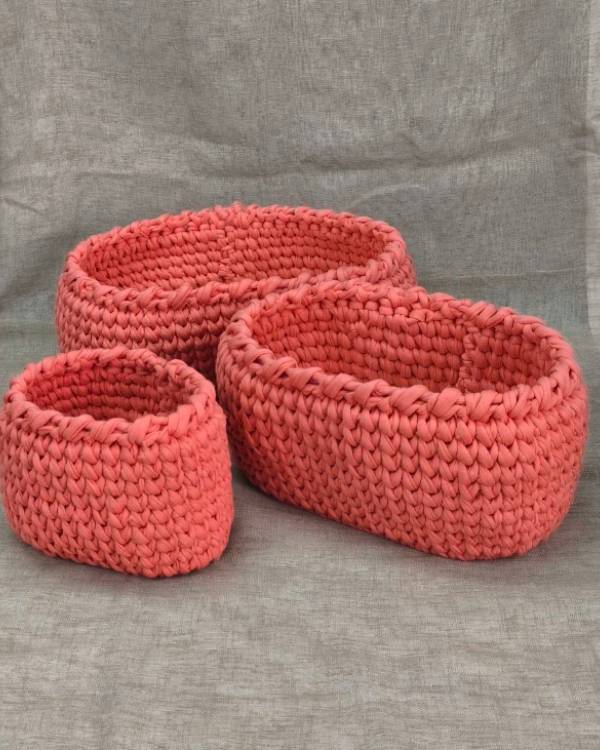 Χειροποιήτα καλάθια με ξύλινη βάση, πλεγμένα με μαλακό νήμα σε χρώμα ρόζ έντονο. Ιδανικό για αποθήκευση και οργάνωση δίαφορων αντικειμένων και τέλειο δώρο για τους αγαπημένους σας. Η διάσταση τους είναι 36 Χ 14 εκ το μεγάλο, 28 Χ 14 εκ το μεσαίο και το μικρό 16 Χ 14 εκ.