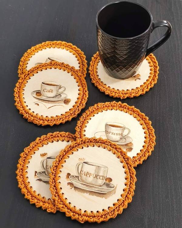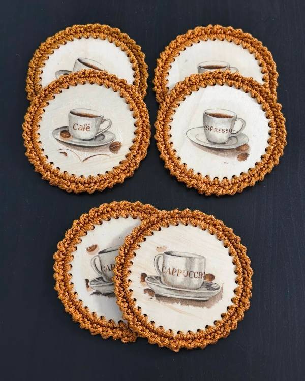 Χειροποιήτα σουπλά σετ 6 τεμαχίων, με φλυτζάνια, διακοσμημένα με την τεχνική του Ντεκουπάζ, περασμένα με βερνίκι αδίαβροχο και γύρω γύρω πλεγμένα με νημα μουσταρδί. Η δίασταση τους είναι 12 Χ 12 εκ.