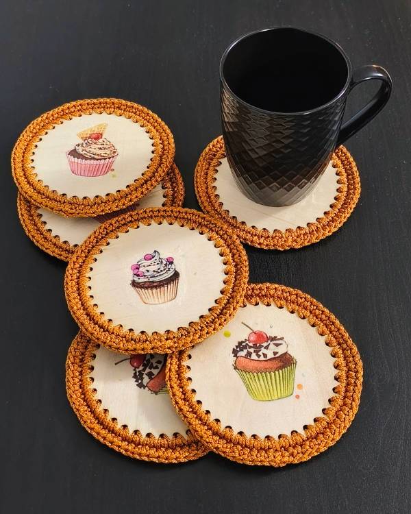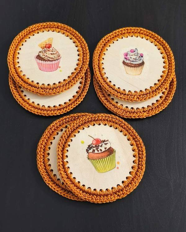 Χειροποιήτα σουπλά σετ 6 τεμαχίων, με κεκάκια, διακοσμημένα με την τεχνική του Ντεκουπάζ, περασμένα με βερνίκι αδίαβροχο και γύρω γύρω πλεγμένα με νημα μουσταρδί. Η δίασταση τους είναι 12 Χ 12 εκ.