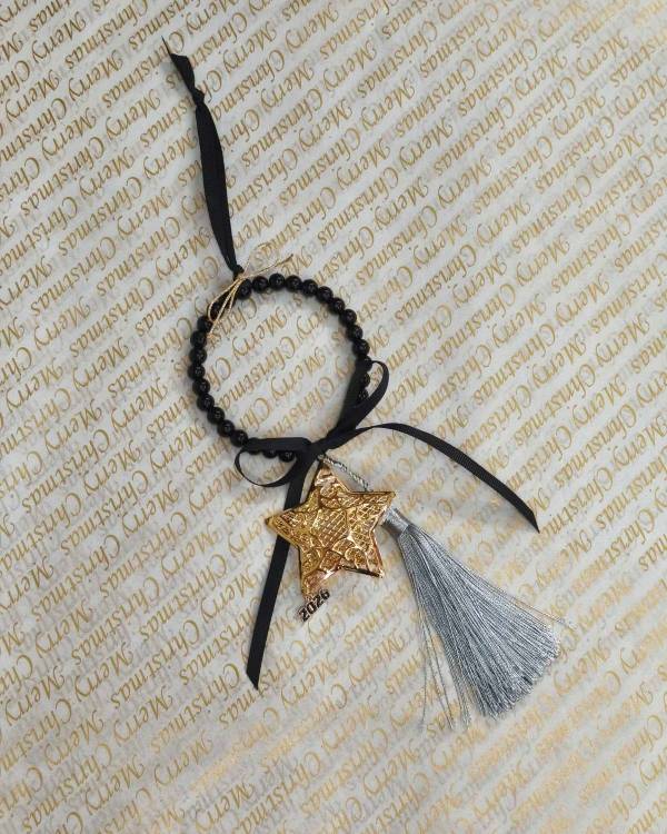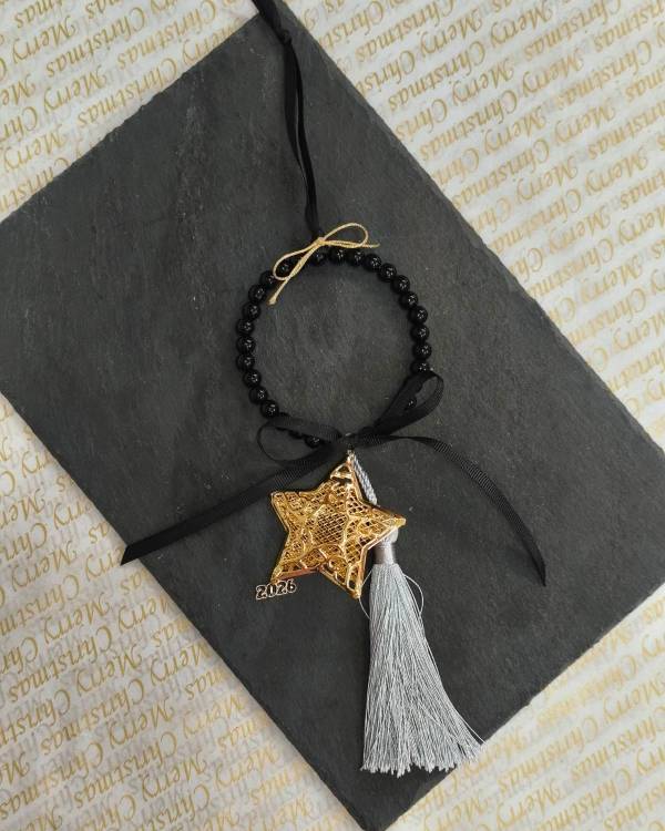 Χειροποίητο γούρι, με στεφανάκι με χάντρες μαύρες, στοιχείο αστέρι σε χρυσό, διακοσμημένο με κορδελες, με φούντα γκρί και μεταλικό στοιχείο 2026. Η δίασταση του είναι, 9 Χ 9 εκ το στεφανάκι, 6 Χ 6 το στοιχείο και το μάκρος που έχει το γούρι είναι 32 εκ. Θα το παραλάβετε σε συσκευασία δώρου.