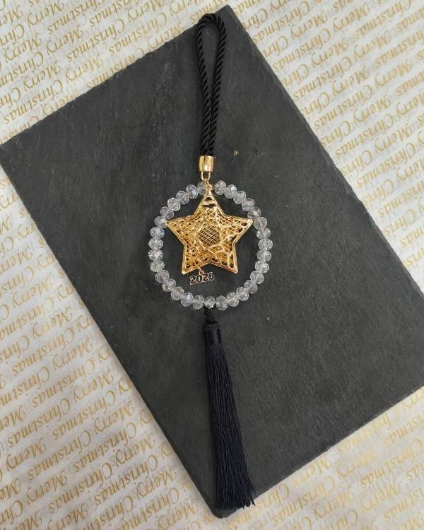 Χειροποίητο γούρι, με στεφανάκι με διάφανα κρύσταλλα, στοιχείο αστέρι χρυσό, διακοσμημένο με σχοινί, με φούντα μαύρη και μεταλικό στοιχείο 2026. Η δίασταση του είναι, 9 Χ 9 εκ το στεφανάκι, 6 Χ 6 εκ το στοιχείο και το μάκρος που έχει το γούρι είναι 33 εκ. Θα το παραλάβετε σε συσκευασία δώρου.