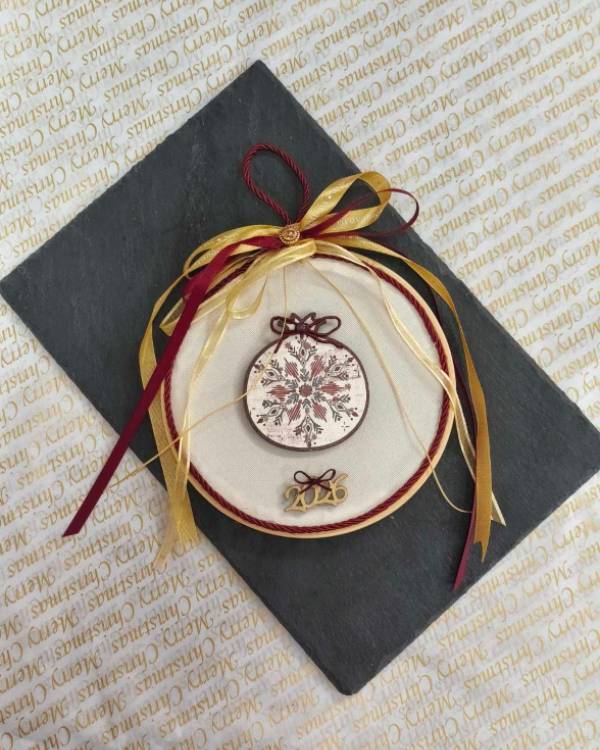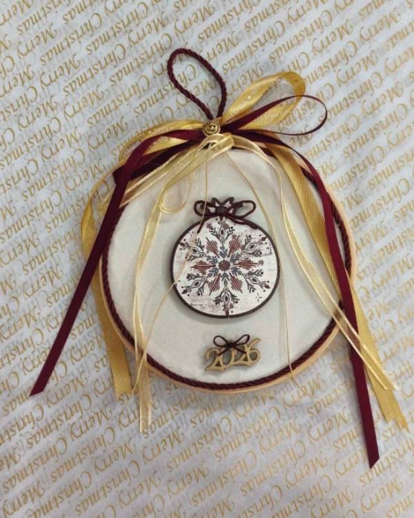 Χειροποίητο γούρι, τελάρο, διακοσμημένο με σχοινί, με κορδέλες και ξύλινο στοιχείο 2026. Η δίασταση του είναι, 16,5 Χ 16,5 εκ και το μάκρος που έχει το γούρι είναι 24,5 εκ. Θα το παραλάβετε σε συσκευασία δώρου.