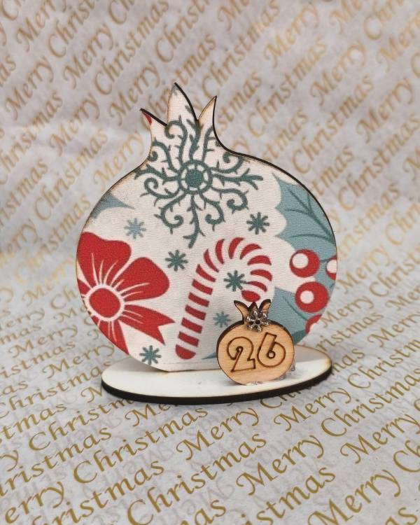 Γούρι ξύλινο επιτραπέζιο ρόδι, με σχέδια και το 2026. Η διάσταση του είναι 10.5 Χ 8,5 εκ.