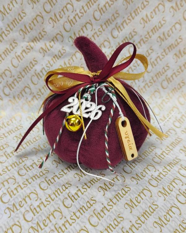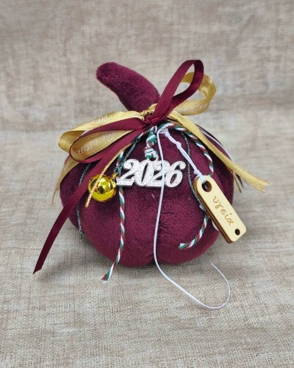 Γούρι κολοκύθα βελούδινη σε μπορντό χρώμα, διακοσμημένη με κορδέλές, κουδουνάκια, με ξύλινο στοιχείο με ευχή και με μεταλλικό στοιχείο 2026. Η διάσταση του είναι γύρω γύρω 29 εκ και το ύψος 12 εκ.