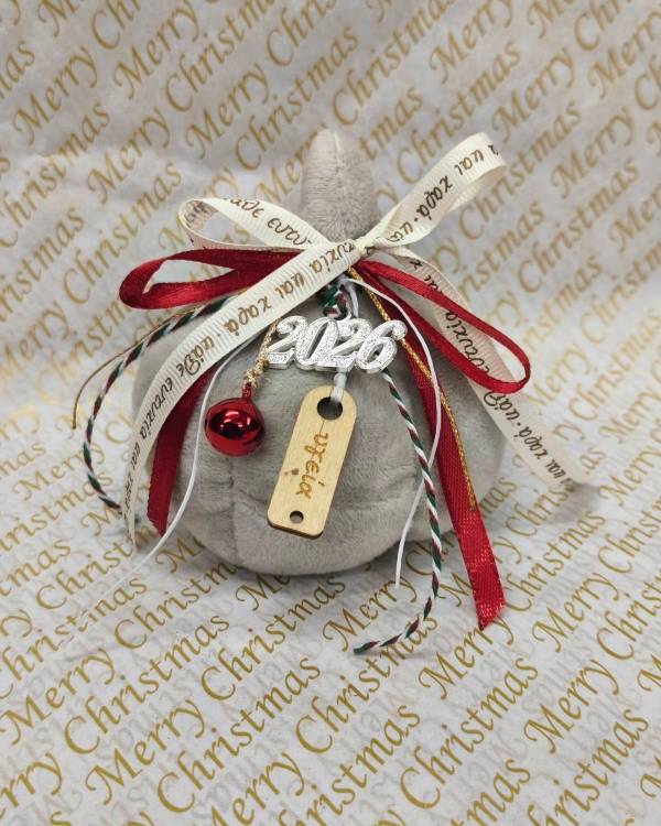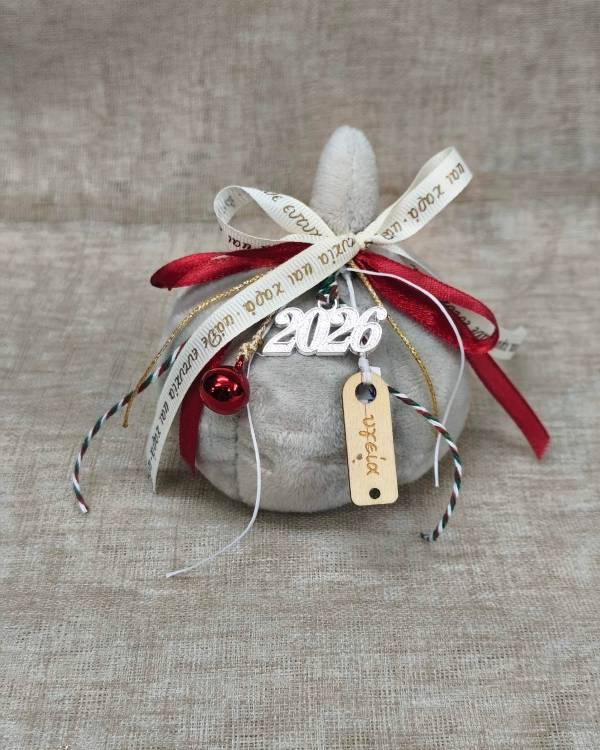 Γούρι κολοκύθα βελούδινη σε γκρί χρώμα, διακοσμημένη με κορδέλές, κουδουνάκια, με ξύλινο στοιχείο με ευχή και με μεταλλικό στοιχείο 2026. Η διάσταση του είναι γύρω γύρω 29 εκ και το ύψος 12 εκ.