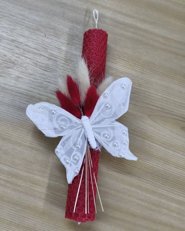 Χειροποίητη λαμπάδα κυρήθρα κόκκινη, με αποξηραμένα και πεταλούδα άσπρη. Η διάσταση της λαμπάδας είναι 21 εκ. Θα την παραλάβετε σε συσκευασία δώρου.