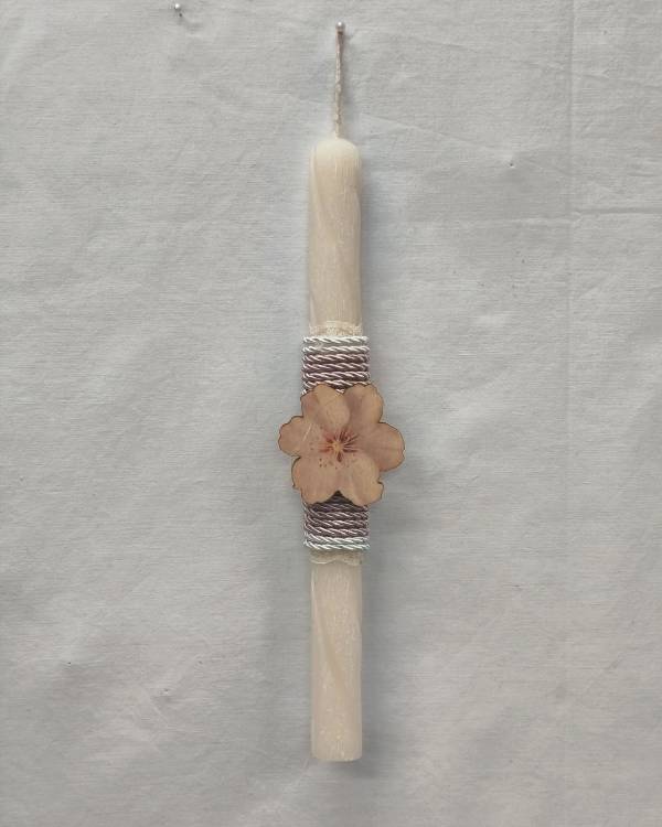 Χειροποίητη λαμπάδα λευκή λεπτή ανάγλυφη, τυλιγμένη με σχοινί και με ένα ξύλινο στοιχείο λουλούδι. Η διάσταση της είναι 25 εκ και το στοιχείο είναι 5 Χ 5 εκ. Θα την παραλάβετε σε συσκευασία δώρου.