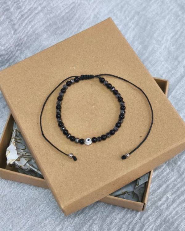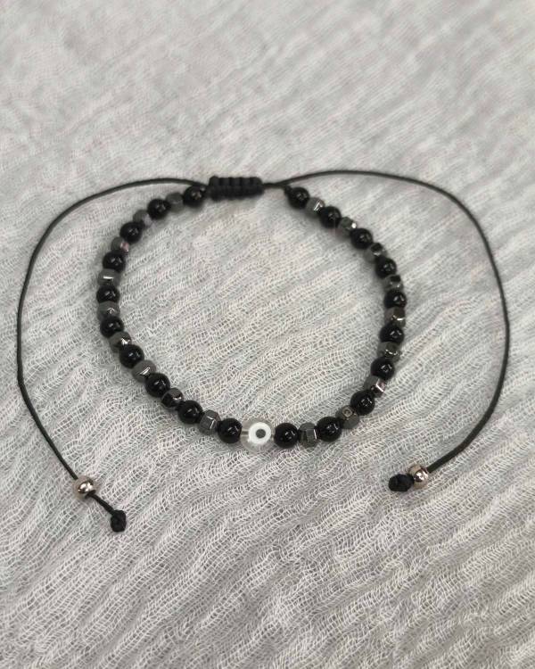 Χειροπιήτο βραχίολι με χάντρες μαύρες, αιματίτες και μια χάντρα μάτι, περασμένες σε κηροκλωστή μαύρη και με κούμπωμα αυξομείωσης. Το μάκρος του είναι 16 εκ. Θα το παραλάβετε σε συσκευασία δώρου.