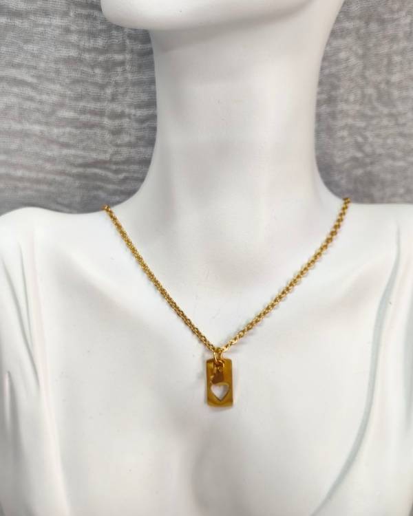 Κολίε αλυσίδα ατσάλινη σε χρυσό, με στοιχείο ατσάλινο πλάκε με καρδια και μια ακόμη καρδούλα. Η δίασταση του στοιχείου είναι 2 Χ 1 εκ και η μικρή καρδούλα είναι 0,50 Χ 0,50 εκ, η αλυσίδα είναι 26 εκ και όλο μαζί είναι 28 εκ. Θα το παραλάβετε σε συσκευασία δώρου.