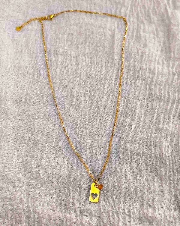 Κολίε αλυσίδα ατσάλινη σε χρυσό, με στοιχείο ατσάλινο πλάκε με καρδια και μια ακόμη καρδούλα. Η δίασταση του στοιχείου είναι 2 Χ 1 εκ και η μικρή καρδούλα είναι 0,50 Χ 0,50 εκ, η αλυσίδα είναι 26 εκ και όλο μαζί είναι 28 εκ. Θα το παραλάβετε σε συσκευασία δώρου.