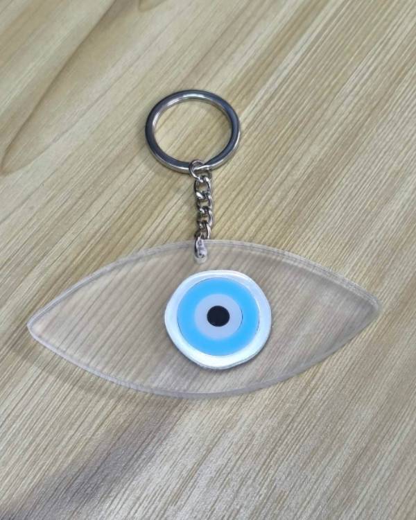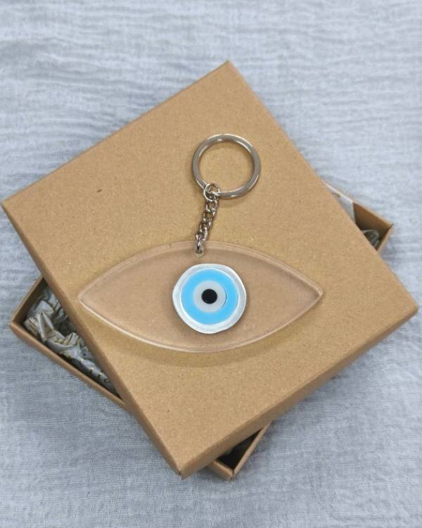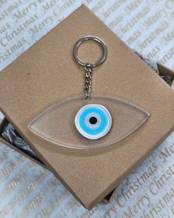 Χειροποιήτο μπρελόκ μάτι απο πλέξι γκλάς, με κρικάκι ασημί. Η διάσταση του είναο 9 Χ 5,5 εκ. Δωράκι για τον εαυτό σας ή για καποιόν αγαπημένο σας. Θα το παραλάβετε σε συσκευασία δώρου.