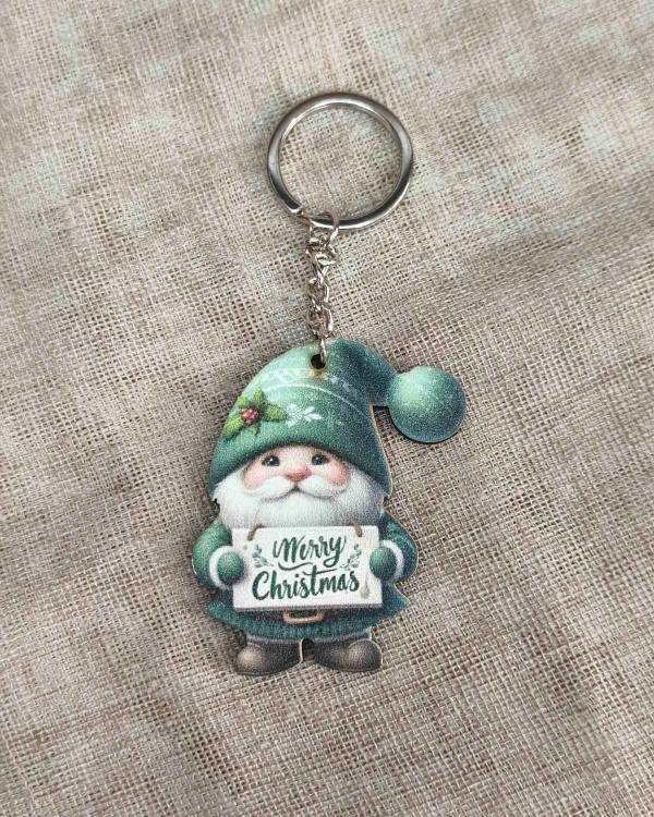 Γούρι μπρελόκ, με ξύλινο στοιχείο χριστουγεννίατικο Άγιος Βασίλης πράσινος. Η δίασταση του είναι 6 Χ 4 εκ και όλο μαζί το μάκρος είναι 11 εκ.