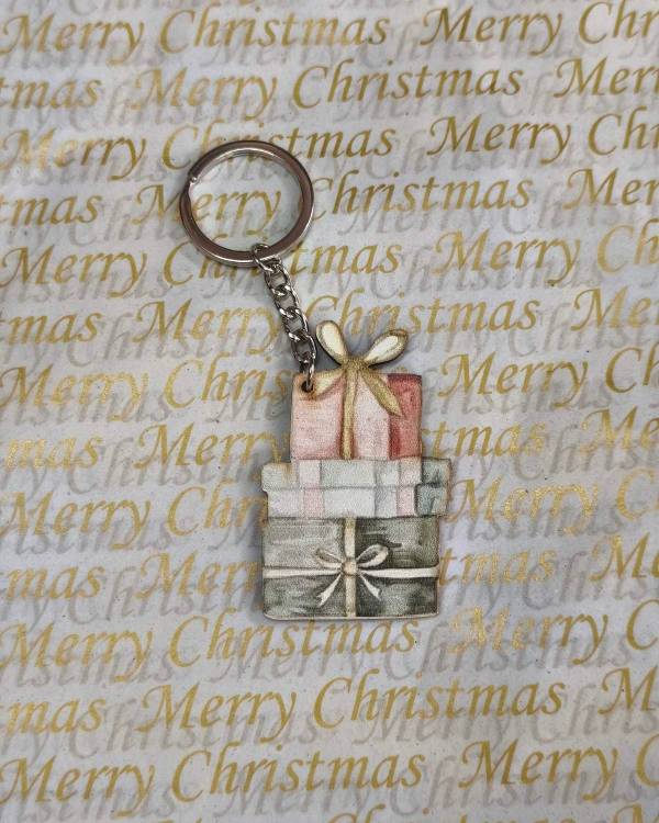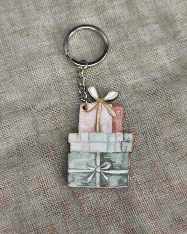 Γούρι μπρελόκ, με ξύλινο στοιχείο χριστουγενίατικο δώρα. Η δίασταση του είναι 6 Χ 4 εκ και όλο μαζί το μάκρος είναι 10 εκ.
