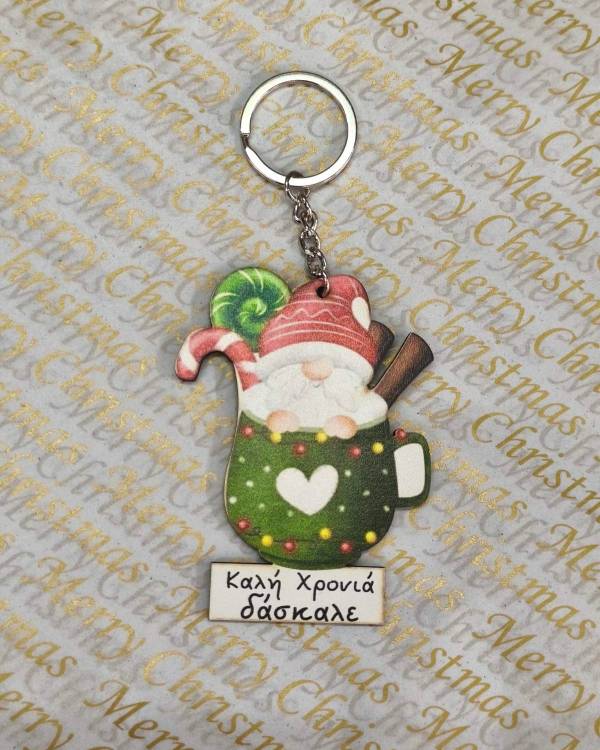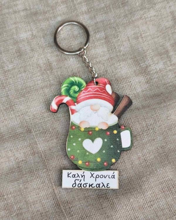 Γούρι μπρελόκ, με ξύλινο στοιχείο χριστουγενίατικο κούπα, ευχή για την δάσκαλος. Η δίασταση του είναι 8 Χ 5,5 εκ και όλο μαζί το μάκρος είναι 13,5 εκ.