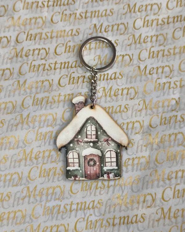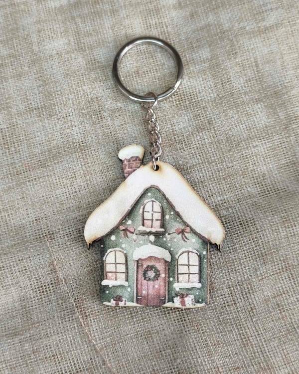 Γούρι μπρελόκ, με ξύλινο στοιχείο χριστουγεννίατικο σπίτι. Η δίασταση του είναι 6 Χ 5 εκ και όλο μαζί το μάκρος είναι 10,5 εκ.