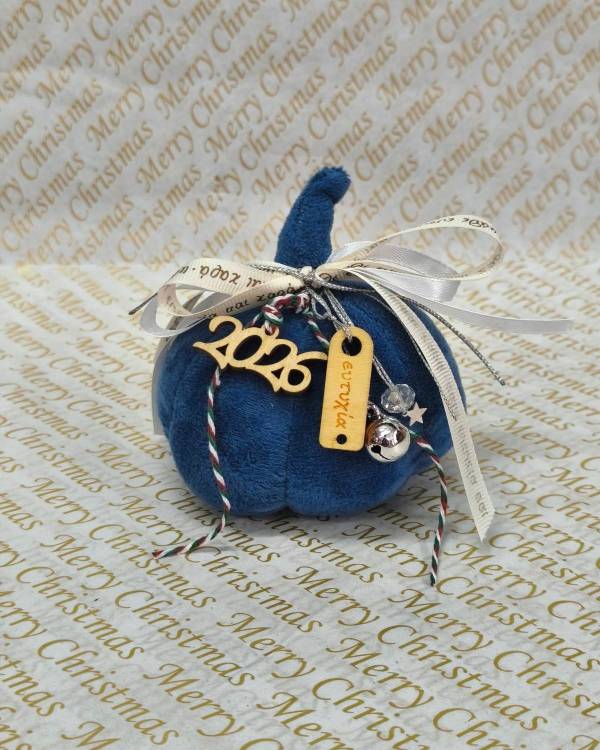 Γούρι κολοκύθα βελούδινη σε μπλέ χρώμα, διακοσμημένη με κορδέλές, κουδουνάκια, με ξύλινο στοιχείο με ευχή και με μεταλλικό στοιχείο 2026. Η διάσταση του είναι γύρω γύρω 29 εκ και το ύψος 12 εκ.