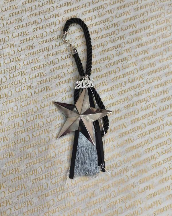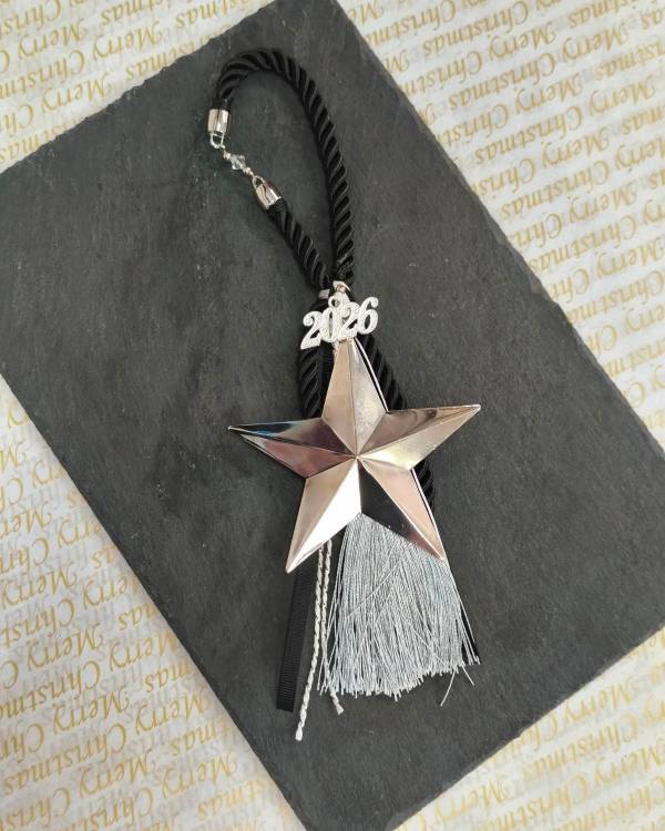 Χειροποίητο γούρι, με μεταλλικό στοιχείο αστέρι ασημί, διακοσμημένο με σχοινι μαύρο, κορδελες, φούντα ασημί και μεταλλικο στοιχείο 2026. Η δίασταση του είναι 10 Χ 10 το αστέρι και το μάκρος που έχει το γούρι είναι 26 εκ. Θα το παραλάβετε σε συσκευασία δώρου.
