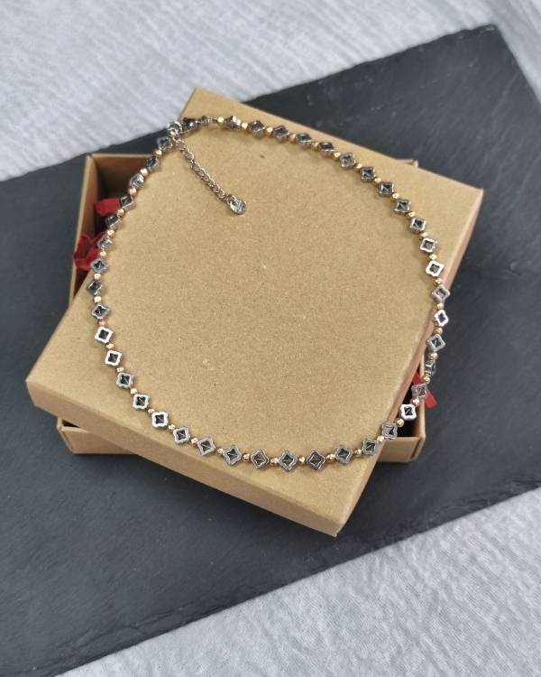 Χειροποιήτο κολίε με πέτρες αιματίτες σε χρυσό και ασημί. Διαθέτει ατσάλινο κούμπωμα, με αλυσιδάκι για αυξομείωση. Η δίασταση του είναι 40 εκ γύρω απο τον λαιμό. Θα το παραλάβετε σε συσκευασία δώρου.