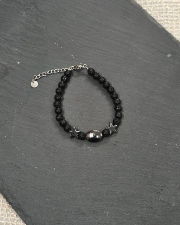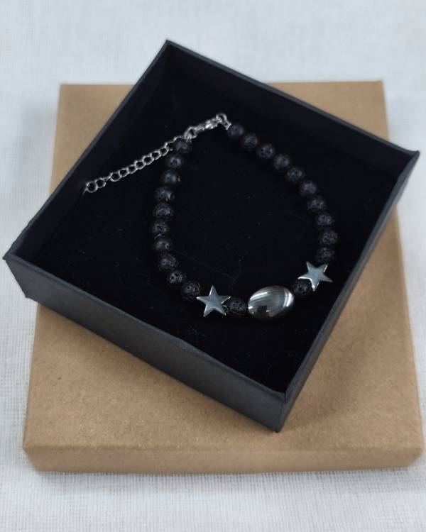 Χειροποιήτο βραχίολι με πέτρες λάβα σε μαύρο χρώμα και αιματήτες αστέρια και οβάλ πέτρα. Διαθέτει αλυσιδάκι με αυξομειώση. Η δίασταση του είναι 18 εκ και τα στοιχεία είναι 4 Χ 1 εκ. Θα το παραλάβετε σε συσκευασία δώρου.