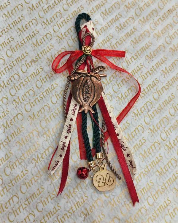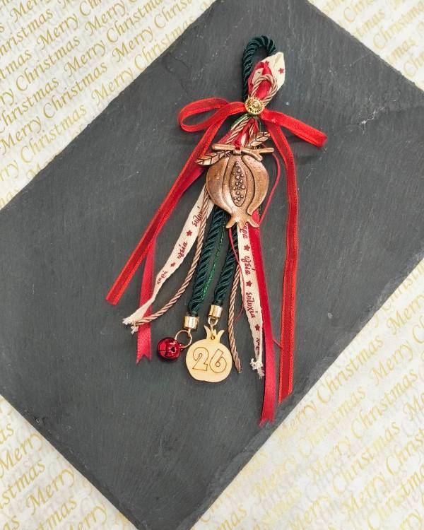 Χειροποίητο χριστουγεννίατικο γούρι ρόδι μεταλλικό σε μπρούτζινο χρώμα, σχοινι πράσινο, χρυσό, κορδέλες, κουδουνάκι και 2026. Η δίασταση του στοιχείου είναι 6 Χ 5 εκ και 21 εκ όλο. Θα το παραλάβετε σε συσκευασία δώρου.