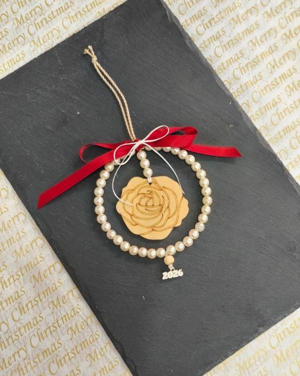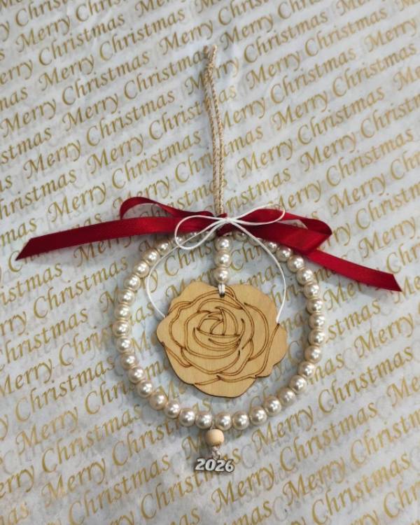 Χειροποίητο χριστουγεννίατικο γούρι, στεφανάκι με πέρλες και ξύλινο στοιχείο τριαντάφυλλο, κορδέλα και μεταλλικό στοιχείο 2026. Η δίασταση του στοιχείου είναι 10 Χ 10 εκ και 21 εκ όλο. Θα το παραλάβετε σε συσκευασία δώρου.