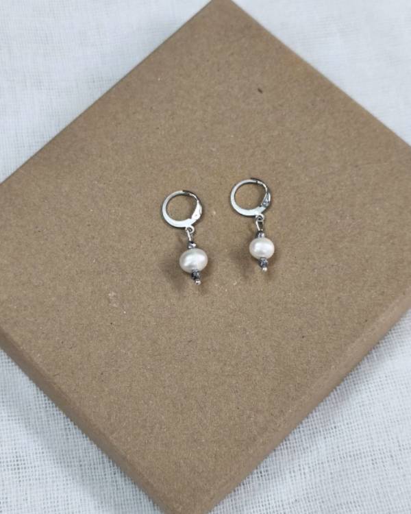 Χειροποιήτα σκουλαρίκια κρεμαστά με κρικάκι ατσάλινο, με μαργαρητάρι του γλυκού νερού και πέτρες αιματήτες σε ασημί. Το μάκρος του είναι 3,5 εκ.Θα το παραλάβετε σε συσκευασία δώρου.