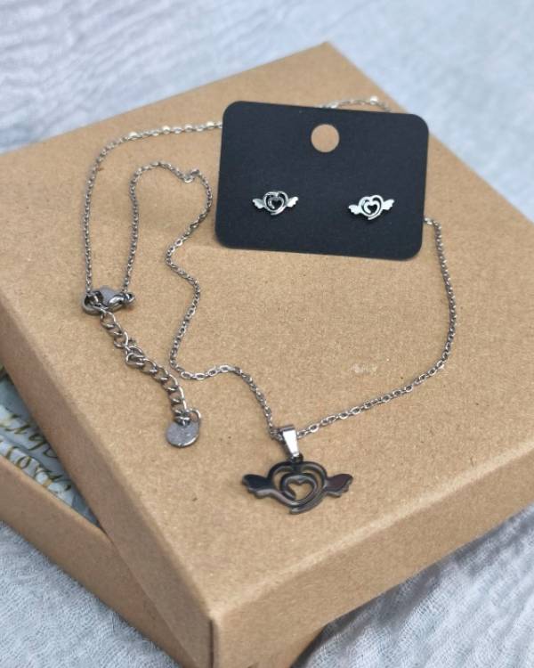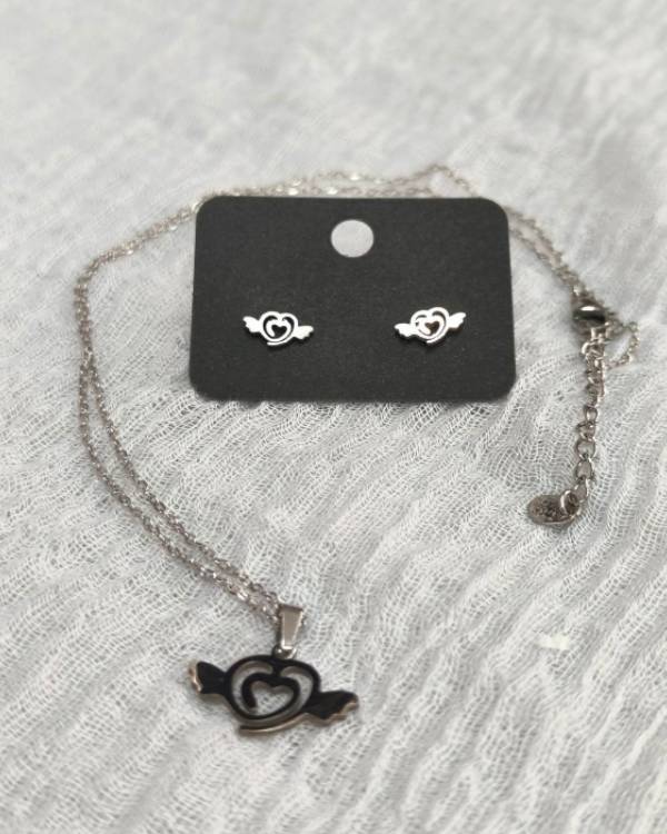 Σέτ κολίε, σκουλαρίκια ατσάλινα καρδία με φτερά . Η δίασταση του στοιχείου είναι 2 Χ 1 εκ και το μάκρος του κολίε είναι 24 εκ και τα σκουλαρίκια είναι 1 Χ 0,50 εκ. Θα το παραλάβετε σε συσκευασία δώρου.