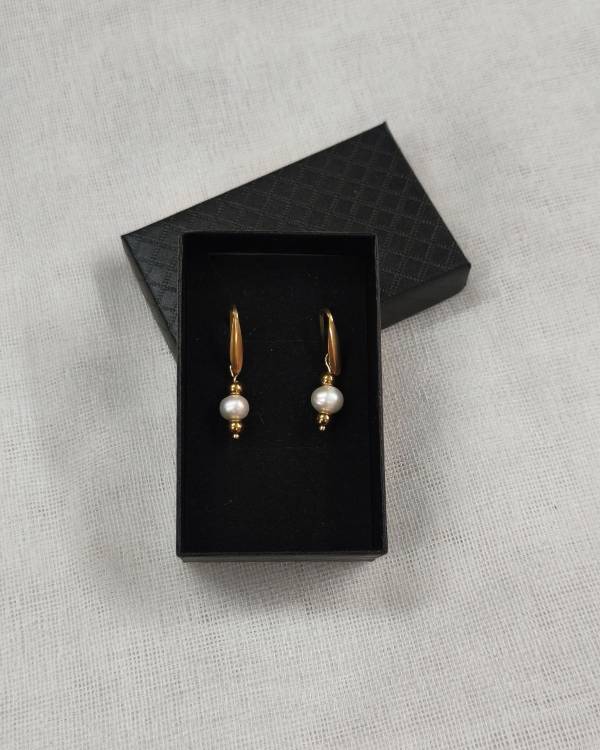 Χειροποιήτα σκουλαρίκια κρεμαστά με μαργαρητάρι, πέτρες αιματήτες και γαντζάκι ατσάλινο σε χρυσό. Το μάκρος του είναι 3,5 εκ. Θα το παραλάβετε σε συσκευασία δώρου.