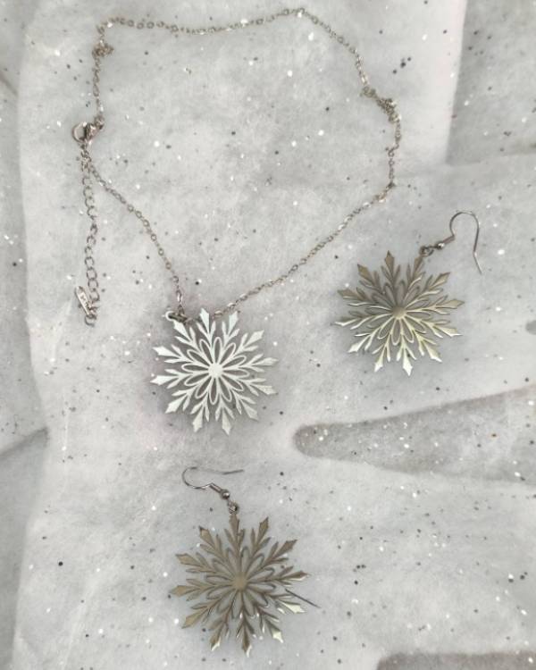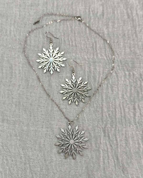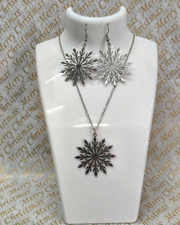 Σέτ κολίε, σκουλαρίκια ατσάλινα χιονονιφάδα. Το κολίε ατσάλινο με αλυσίδα και στοιχείο χιονονιφάδα σε ασημί χρώμα και τα σκουλαρίκια ατσάλινα με στοιχείο χιονονιφάδα. Η δίαστασή του κολίε είναι 21 εκ η αλυσίδα , το στοιχείο 4 Χ 4 εκ και όλο μαζί είναι 25 εκ, τα σκουλαρίκια είναι το στοιχείο 4 Χ4 εκ και όλο μαζί είναι 6 εκ. Ένα υπέροχο σέτ κολίε και σκουλαρίκια για όλες τις ώρες για σας και για τους αγαπημένους σας. Θα το παραλάβετε σε συσκευασία δώρου.