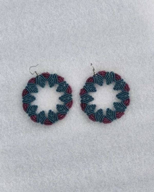Χειροποιήτα σκουλαρίκια μακραμέ κρίκοι, πλεγμένα με κηροκλωστή πετρόλ και ρόζ σκούρο. Η δίασταση του είναι 5,5 Χ 5,5 εκ και το μάκρος του μαζί με το ατσάλινο γαντζάκι είναι 7 εκ. Θα τα παραλάβετε σε συσκευασία δώρου.