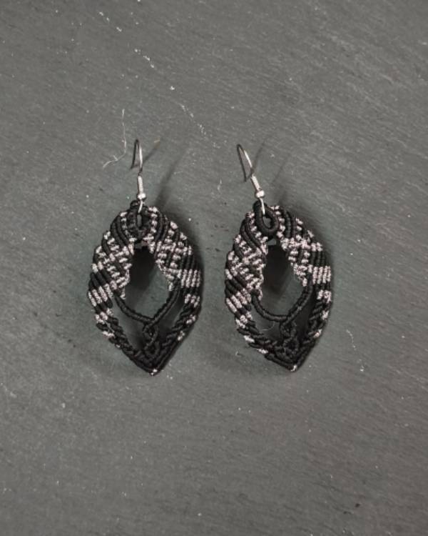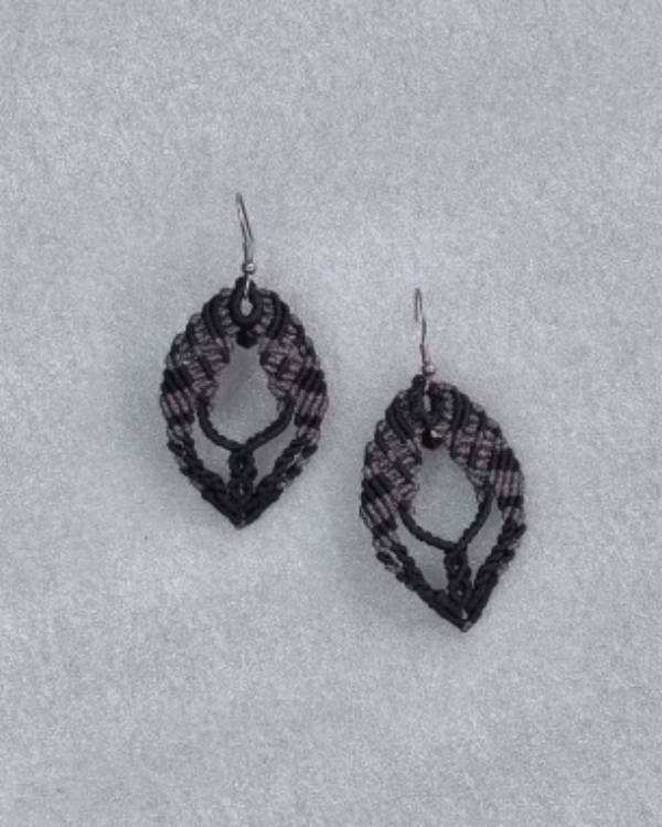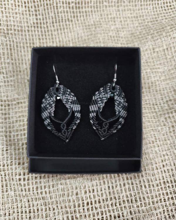 Χειροποιήτα σκουλαρίκια μακραμέ, πλεγμένα με κηροκλωστή μαύρη και γυαλιστερή μελιτζανί. Η δίασταση του είναι 5 Χ 3,5 εκ και το μάκρος του μαζί με το ατσάλινο γαντζάκι είναι 6,5 εκ. Θα τα παραλάβετε σε συσκευασία δώρου.