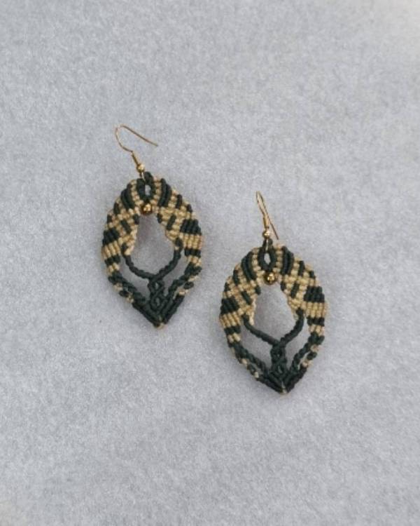 Χειροποιήτα σκουλαρίκια μακραμέ, πλεγμένα με κηροκλωστή πράσινη και σταχύ. Η δίασταση του είναι 5 Χ 3,5 εκ και το μάκρος του μαζί με το ατσάλινο γαντζάκι είναι 6,5 εκ. Θα τα παραλάβετε σε συσκευασία δώρου.