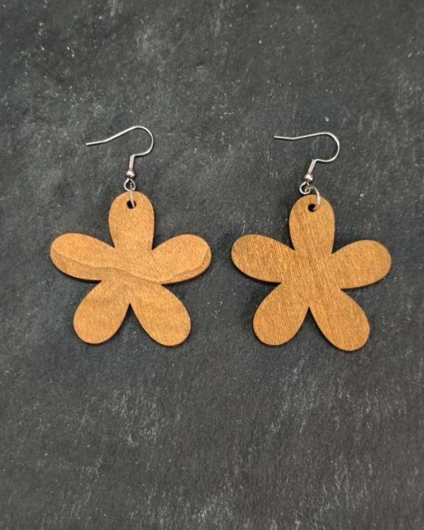 Ξύλινα σκουλαρίκια λουλουδάκια σε καφέ ανοιχτό χρώμα, με ατσάλινο γαντζάκι. Η δίασταση που έχουν  4,5 Χ 4,5 εκ και το ύψος είναι 6 εκ.