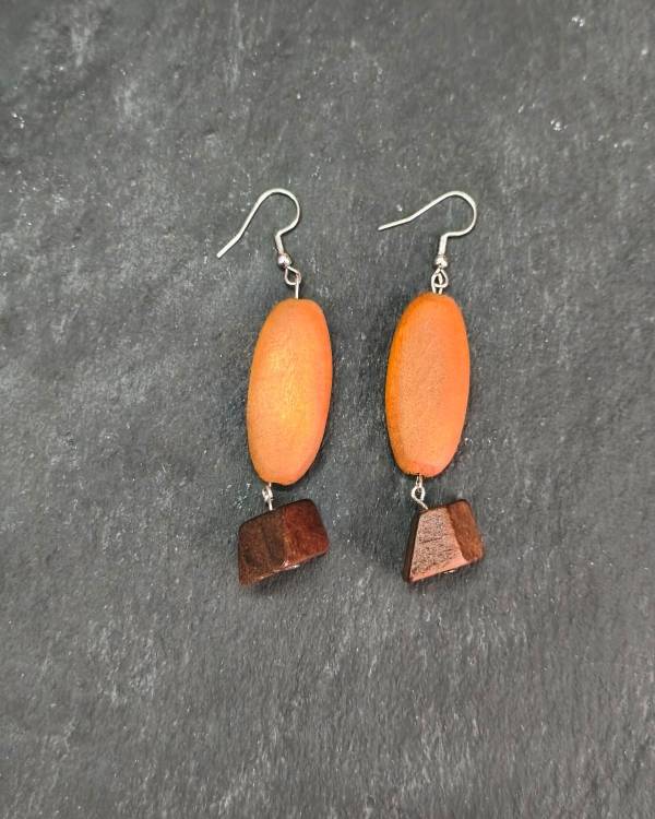 Ξύλινα σκουλαρίκια μακρόστενα, σε καφέ ανοιχτό χρώμα και σκούρο,  με ατσάλινο γαντζάκι. Η δίασταση που έχουν τα στοιχεία είναι, 3,5 Χ 1,5 εκ, 1,5 Χ 1 εκ και το ύψος είναι 8 εκ.