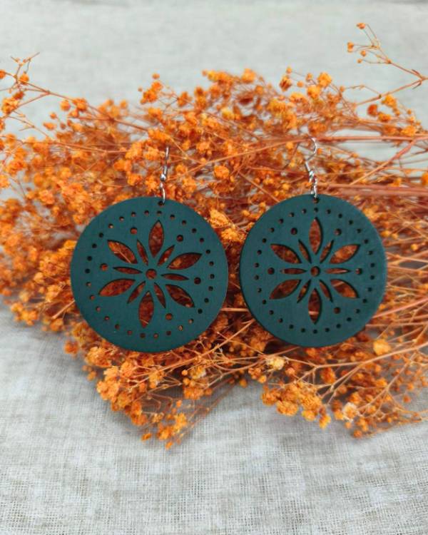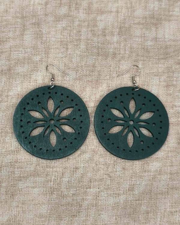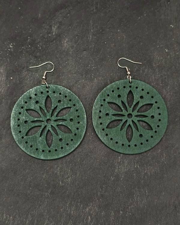 Ξύλινα σκουλαρίκια στρογγυλά σε πράσινο χρώμα, με ατσάλινο γαντζάκι. Η δίασταση του είναι 6 Χ 6 εκ και το ύψος είναι 8 εκ.