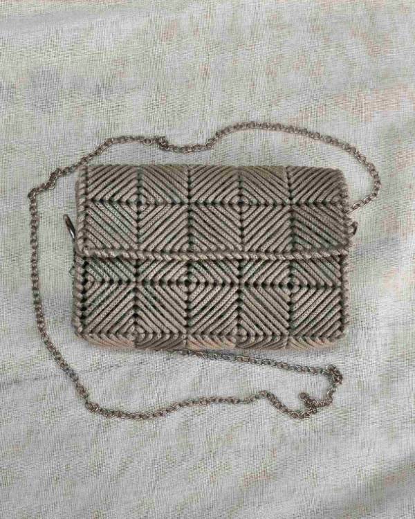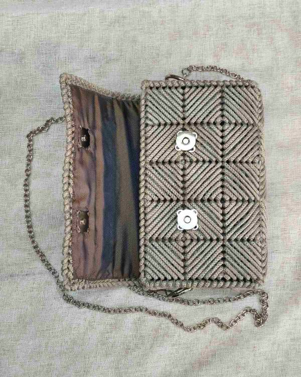 Χειροποιήτη τσάντα πλεγμένη πάνω σε πλέγμα με νήμα εκρού, με επένδυση, μαγνητάκια για κούμπωμα και αλυσίδα. Η δίασταση της είναι 14 εκ το ύψος, 19 εκ το φάρδος και η αλυσίδα είναι 1,20 εκ.