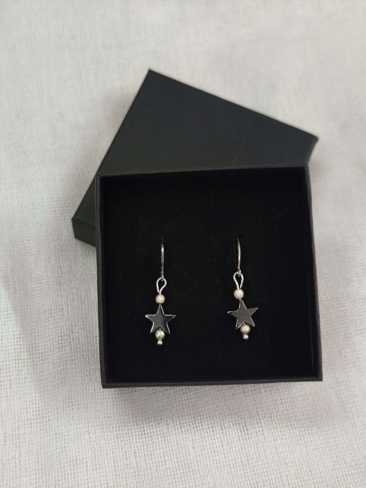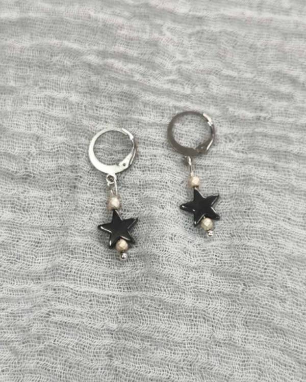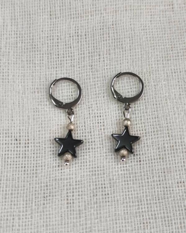 Χειροποιήτα σκουλαρίκια κρεμαστά με κρικάκι ατσάλινο, πέτρες αιματήτες σε σχήμα αστέρια και με πέτρες αιματήτες. Το μάκρος του είναι 3,5 εκ. Θα το παραλάβετε σε συσκευασία δώρου.