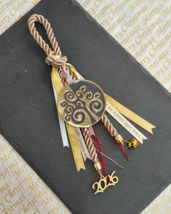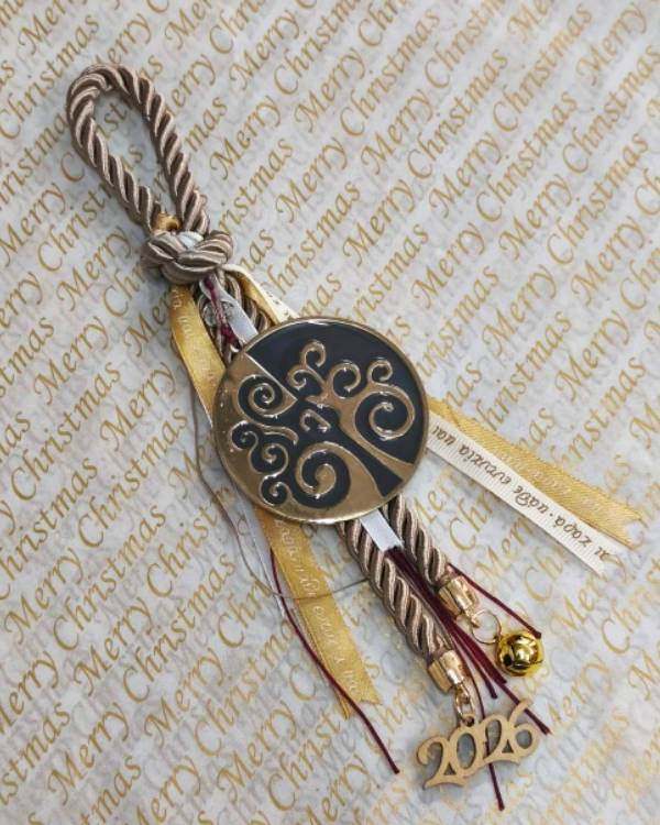 Χειροποίητο χριστουγεννίατικο γούρι με μεταλλικό στοιχείο δέντρο ζωης σε γκρί χρυσό, σχοινί καφέ ανοιχτό και με ξύλινο στοιχείο 2026. Η δίασταση του στοιχείου είναι 6,5 Χ 6,5 εκ και 26 εκ μαζί με το κορδόνι. Θα το παραλάβετε σε συσκευασία δώρου.