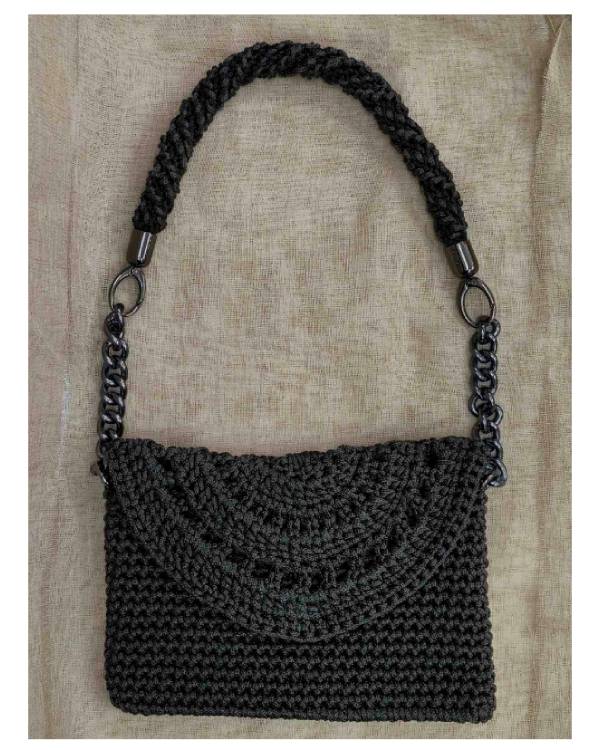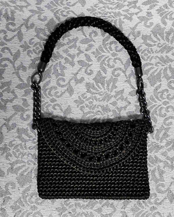 Χειροποίητη τσάντα, πλεγμένη με ανθρακί νήμα, με επένδυση και με χερουλι που είναι το μισό αλυσίδα νίκελ και το υπόλοιπο πλεκτό με νήμα μαύρο και ανρθακί και έχει μαγνητάκι γαι κούμπωμα.